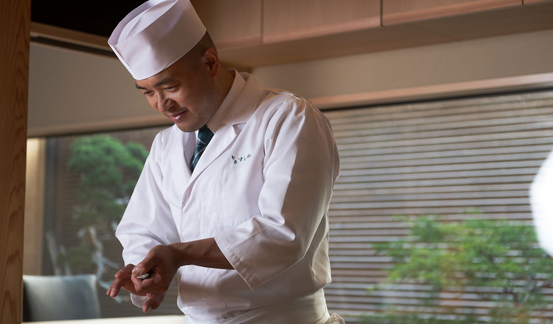 築90余年、モダンな雰囲気に再生させた本坊筋にある歴史ある建物。扉を開けた瞬間、カウンター越しに飛び込んでくる見事な坪庭の景色に目を奪われる。「雨の日や夕暮れ時の風景がまた一段といいですよ」と声をかけてくれたのは店主の小野田和明さん。ここ『旬魚 すし和』は、築地市場の場外にあった有名鮨店や京都のおばんざい屋で腕を磨いた小野田さんの店だ。東京・世田谷で鮨店を営んだ経験を持つ小野田さんが名古屋で店を出すため、店舗探しに費やした時間は約2年。あきらめかけていたときに「いい物件がある」と声がかかったのがこの場所だ。緑区にある『三好雀』という和菓子店が実家の小野田さんは「名古屋で育ちましたが、那古野のことは知りませんでした。最初訪れたとき、京都の祇園のような風情あるところが面白いと思いましたし、歴史ある場所でこじんまりやりたいという希望とも一致していました。加えて、この庭に惚れ込んでしまったこともあり、この場所で店がオープンできることが決まった時は本当に嬉しかったです」と話す。