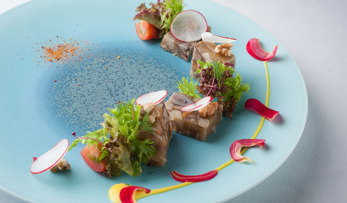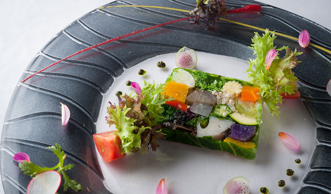 この土蔵を活かしたレストランのスペシャリテはテリーヌだ。その理由は、テリーヌの語源はTerre(テール)で、大地という意味を持つことに関係している。「テリーヌは、もとはすり鉢状の土鍋で作ったと言われています。当店は土壁を何度も塗り重ねた土蔵です。”土”というつながりを大切に、スペシャリテをテリーヌとしました」と松浦さん。テリーヌはランチ、ディナーとも、季節ごとに食材を変えて登場する。定番は野菜のテリーヌだ。 用いる野菜は、三重県津市の自然農法で栽培された無農薬野菜が中心。これを季節ごとに野菜を変えて構成するのだが、その調理法が興味深い。18種類の野菜を和風だしでおひたしにしてテリーヌ型で固め、味付けはイタリア・シチリアの塩と、あとは野菜の旨みだというのだ。地元で採れた食材を大切に扱う松浦さんならではの一皿。この日はほかに、丸ごと1羽さばいて作る名古屋コーチンのテリーヌ、国産とフランス産を10種類用いたキノコのテリーヌもあり、どれにしようかと迷ってしまう内容だった。