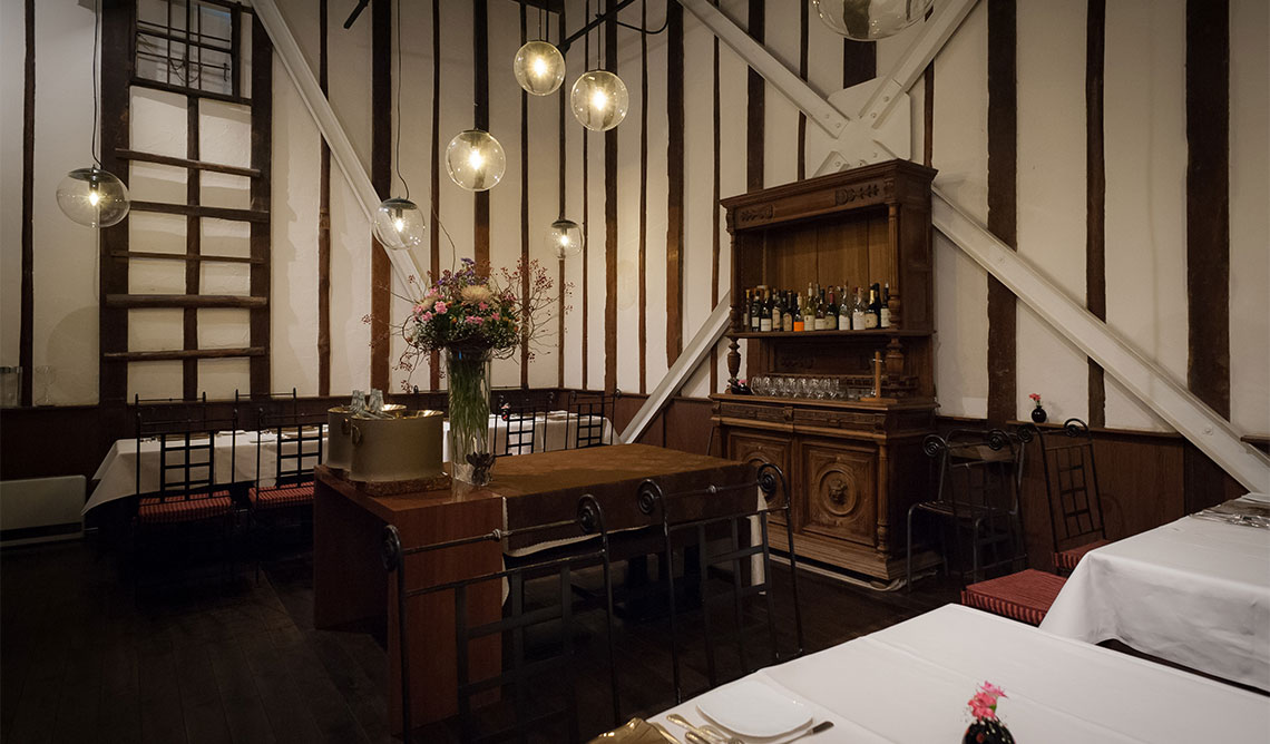 店舗入口へと導いてくれる中庭のアプローチは、松浦さんも職人と一緒になって手掛けたもの。ゆるやかに弧を描くそれが黒色なのは、コンクリートに炭を混ぜているからで、さらに雫の模様を施してある。行き着いた先にある、背の低い引き戸を開けると目の前に広がるのは天井の高いレストラン空間。和の趣の中で、西洋のアンティーク家具やペンダントライトは、ずっとここにあったかのようにしっくりと馴染んでいる。「最初は床の張り替えから漆喰塗りまで、かなりリノベーションをしました。そのあとも毎年少しずつ手入れをしているんですよ」。建物を持ち主から預かり、守り人としてレストランを営む松浦さんは、蔵を愛おしそうに眺めながら教えてくれた。