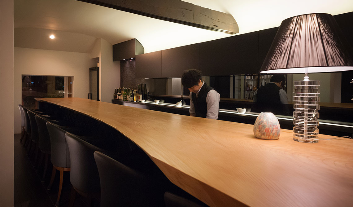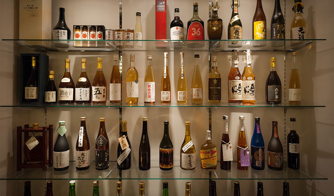 ケヤキの一枚板カウンターが目を引く店内には、ガラス棚があり、熟成古酒がずらり。それはほんの一部で、70種類以上のストックを持つという。熟成期間は3年ものから、1970年代に醸造されたものもある。また、熟成期間や方法により引き出された特徴を、よく感じられるように5種類のワイングラスとオリジナル酒器から最適なものを提案する。