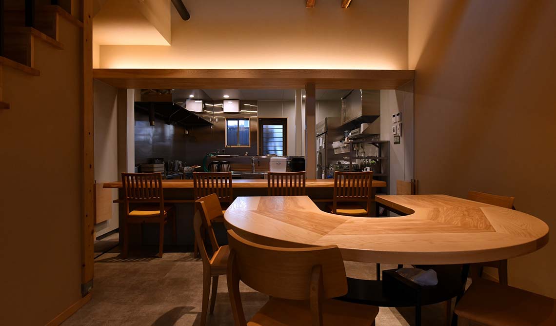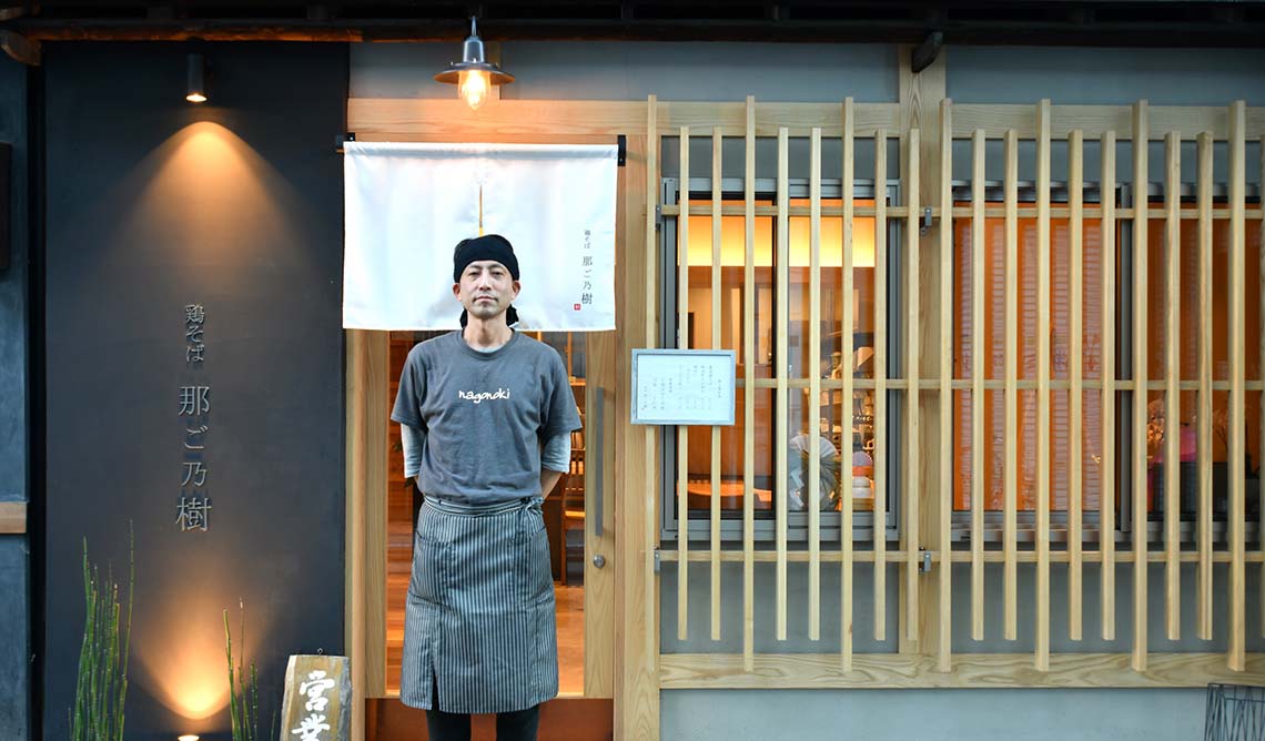 江川線から東へ1本入った那古野エリアの裏路地、新長屋筋。和食店を思わせる店の扉を開けた瞬間に目に飛び込んでくるのは、カウンター越しに見えるオープンキッチンと2階まで吹き抜けにした爽快感たっぷりの空間。お一人様もグループでも気軽に利用できる、ラーメン店らしからぬお洒落な雰囲気が漂うここ『鶏そば 那ご乃樹』は、食べログ・ラーメン部門で最高得点を獲得したことでも知られる春日井市の名店『はる樹』の店主・新本茂樹さんが「ラーメン屋らしくないラーメン屋」をコンセプトに築90余年の古民家を理想の空間に仕上げ、オープンさせた2号店だ。
