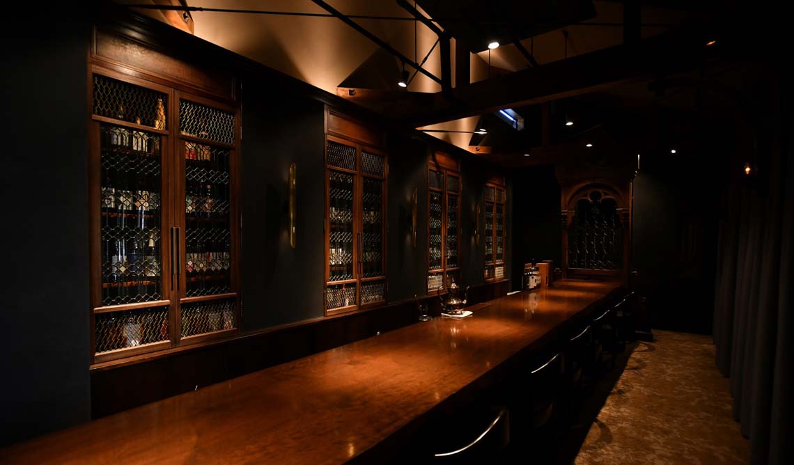 そんなこだわりの店内には、ルネッサンス音楽が静かに流れ、極力照明を落としたダークな空間に浮かび上がる約6mもあるアフリカンチェリーで作られた1枚板のカウンター。イギリスの教会で実際に使われていたという100~150年前のアンティークのガラスや照明、教会の門などオーセンティックなものが醸し出す落着きある異空間が広がっている。