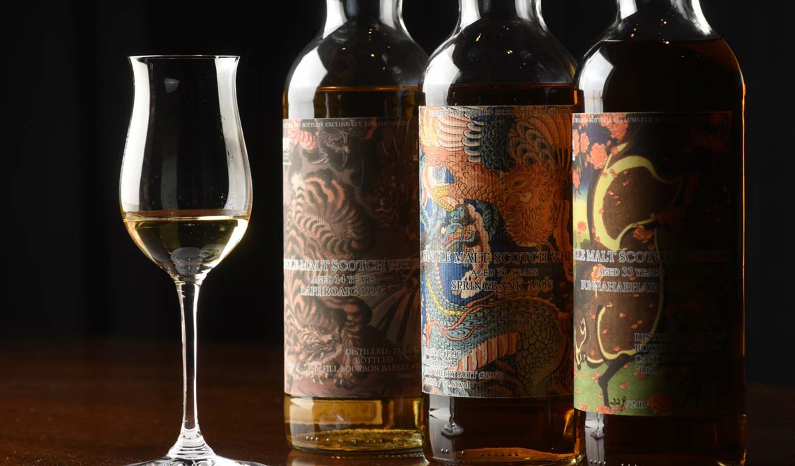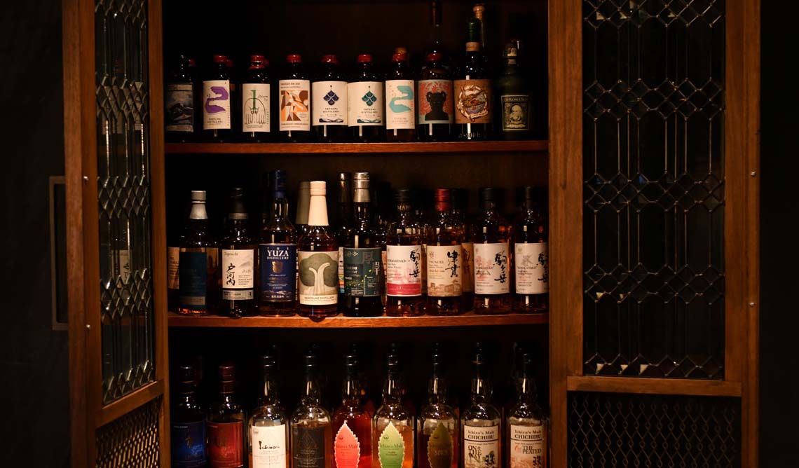 名古屋マリオットアソシアホテルで働き始めた頃より、自身で店を持つことを決めていたという清水さん。当時よりコツコツと集めていたウイスキーは実に200本以上にも。現行品を大切に、オールドボトルやヴィンテージ、ボトラーズ、国産など今となっては高額となってしまったウイスキーも数多くある中、購入した当時の価格で提供しているというのも清水さんの人柄が感じられるエピソードだ。そのほかジンやラム、ブランデーは「新たな発見をしてほしい」との思いからなるべく珍しいものを取り揃えている。これらのボトルは、「お客様との会話の中からおすすめのお酒を提案したい」との思いから、あえてキャビネットタイプの棚に並べ、ボトルが見えないように工夫しているという。ウイスキーにしても、ほかの酒にしても上質な味わいと残り香の余韻を楽しむことのできる個性的なボトルを幅広く仕入れ。購入する際の清水さんのさらなるこだわりというのが「ラベルが楽しいものを」とのこと。カウンターに座り、いろいろなボトルを眺めながら過ごせないのは少し残念な気もするが、注文をした際に目の前に並べられるボトルに貼られた歌川国芳の「禽獣図絵 龍虎」、恐竜やダンスのシーンなどが描かれた希少なラベルをしみじみ眺めながらグラスを傾けるのも一興だ。